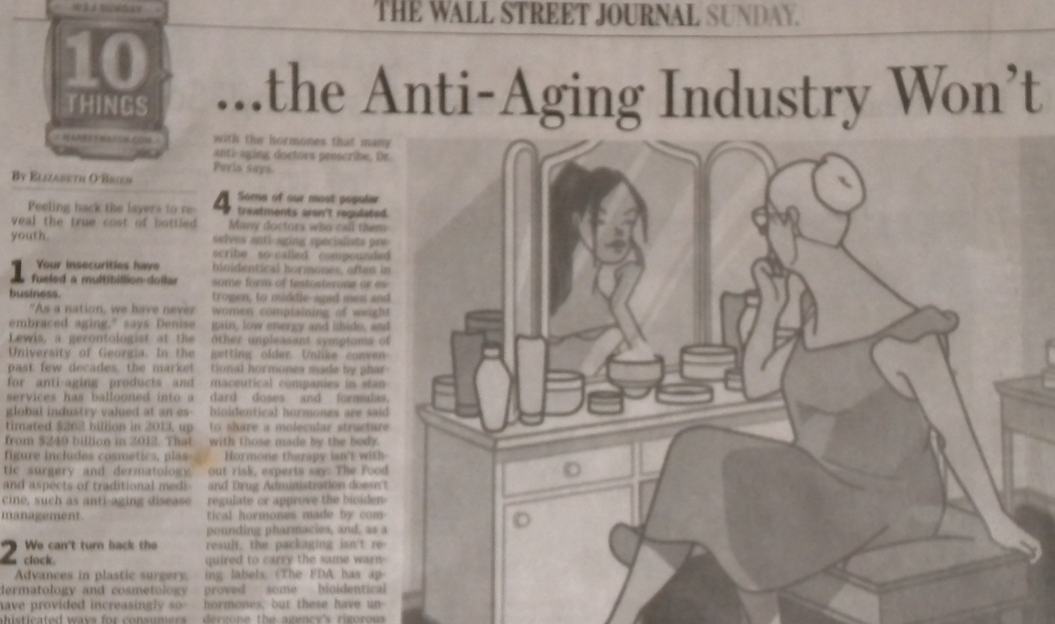 An article entitled “10 things the Anti-Aging Industry won’t say” in the Wall Street Journal recently criticized the attempts of earnest people to mitigate the effects of aging, essentially saying that anti-aging is a fruitless quest, so stop fighting the inevitable and save your money. Though I often read and highly recommend this prestigious newspaper they are clearly not immune to frivolous and negative rhetoric.