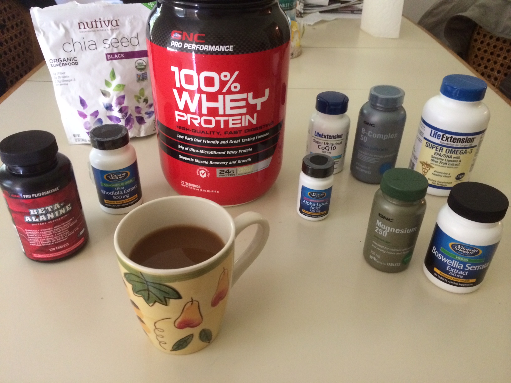 Notice the ones in the picture above. They are layed out left to right in order of their best application. Coffee, Beta-alanine, Rhodiola all stimulate greater exertion and workout energy. (Isnt that the name of the game?) These are best taken 30-40 minutes before the session. If you are serious about your fitness you should really invest in a can of whey protein. It is the quickest way to replenish and restock your muscles for growth after exercise. It also strengthens your immunity. Coq10, B vitamins and lipoic acid are all essential to energy generation. They really do make a difference if you use them regularly. Magnesium and the herb Boswellia are very effective in relieving the joint and muscle pain incurred with a hard workout. Well worth the investment.